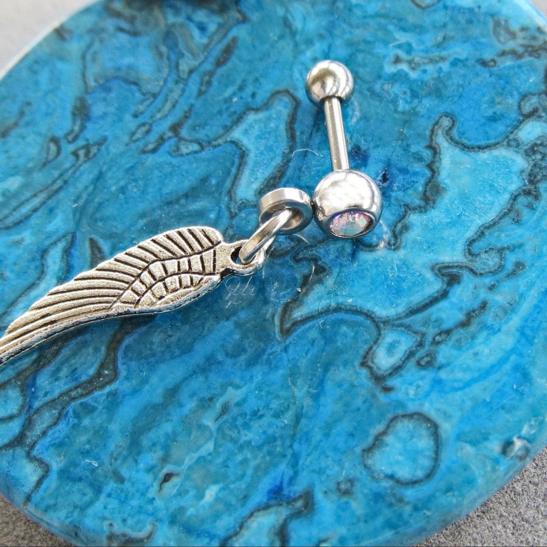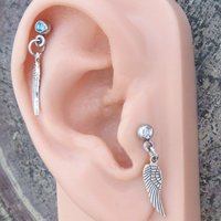Sweet little angel wing dangle stud for tragus, helix, or cartilage piercings in your choice of gemstone color: Clear, Aurora Borealis, or Aqua Blue
