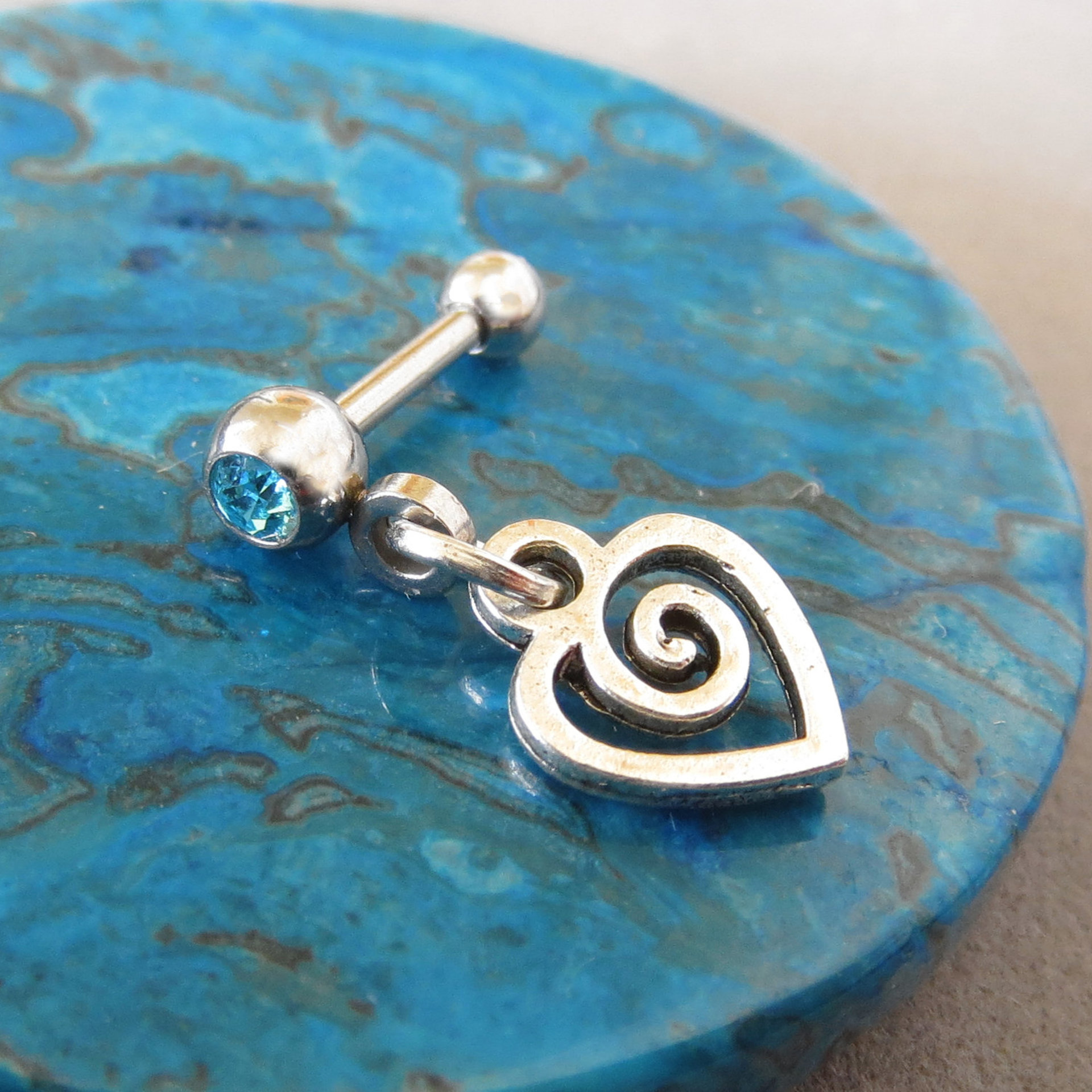 Dangling from this gemstone cartilage stud is a sweet little heart with an inner swirl. Wear it in a tragus, helix, or other cartilage piercing.