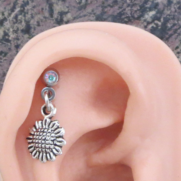 Sunflower Helix Stud Earring 18g, Blue or Clear Gemstone Tragus Piercing Dangle, Flower Cartilage Earring
